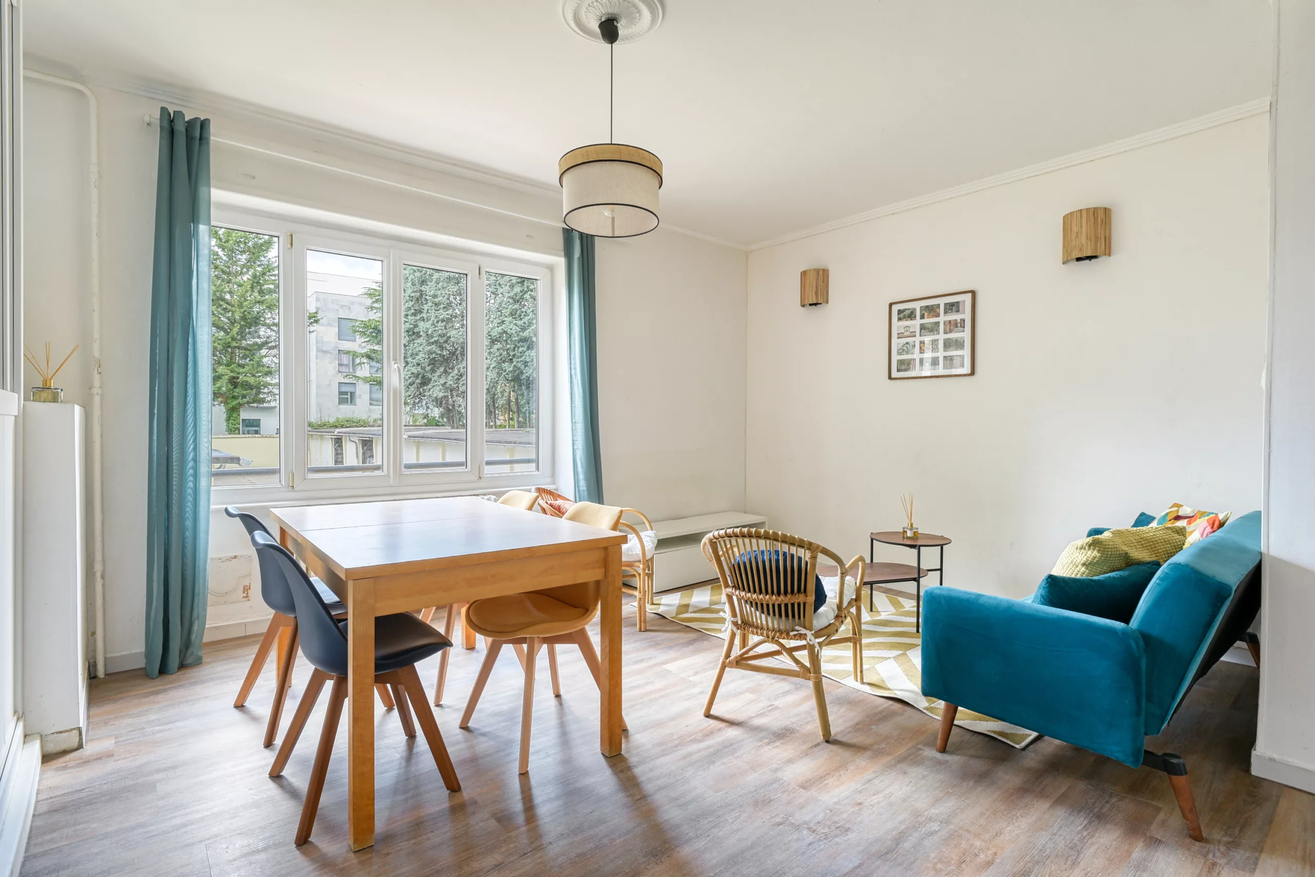 Espace salon / salle à manger : – table avec 4 chaises – canapé – 2 fauteuils – télévision